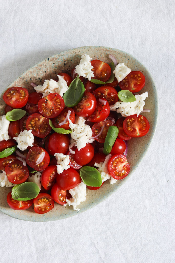 Server tomatsalaten med en god håndfuld basilikum, rødløg, lækre bider af bøfmozzarella og en sommerlig salatdressing. Vil du bytte bøfmozzarellaen ud med en anden ost, er fetaen det oplagte alternativ!
